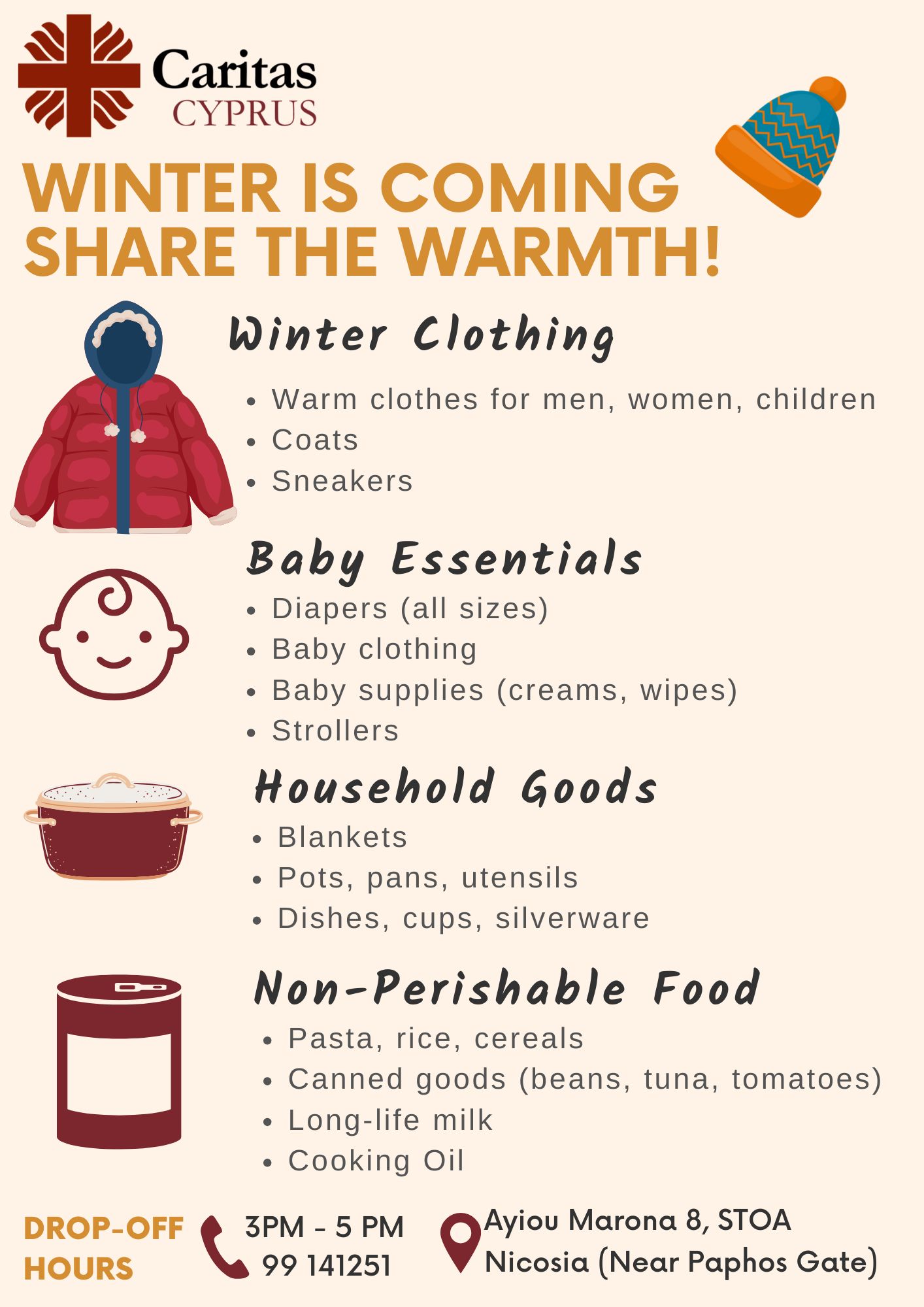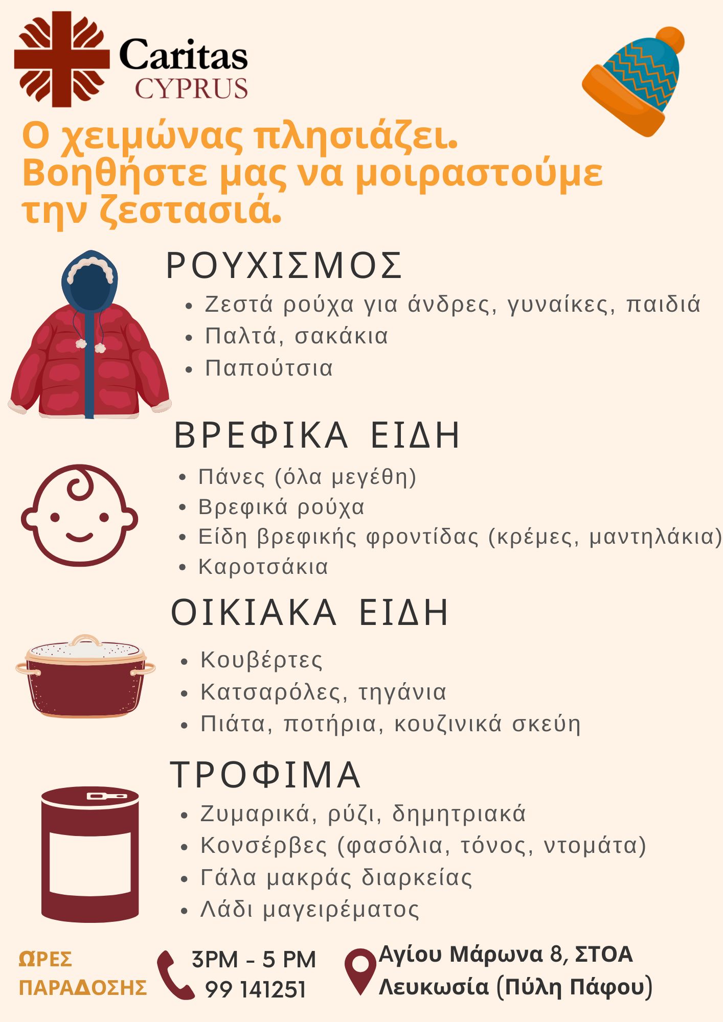 Donate. Support from caring people allows Caritas Cyprus to serve the growing number of individuals and families in need in our community. Besides food, Caritas is now collecting clean, wearable unwanted clothing and shoes as well as used household and baby items. Donations help people and decrease waste–please share what you don’t wear or use! Here is our donations flyer ( English | Greek ), in case you want to share it. We are always in need of baby goods and non-perishable food stuff for our emergency food packs.